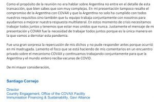 «En mi presentación tampoco resalté el compromiso de la Argentina con Covax y que la Argentina no solo ha cumplido con todos nuestros requisitos sino también que tu equipo trabaja conjuntamente con nosotros para ayudarnos a mejorar nuestra respuesta multilateral”, aseveró Cornejo.