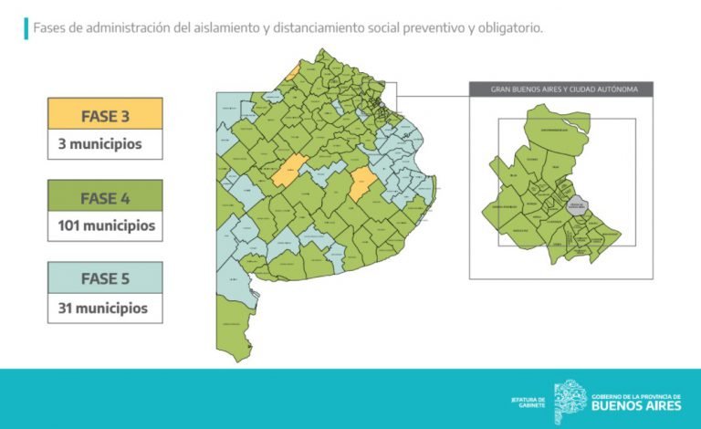 Por otra parte, en la Fase 4 hay 101 municipios con el descenso de Coronel Rosales desde la Fase 5 producto de un pequeño aumento de casos. En tanto, la Fase 5 cuenta con 31 distritos con la incorporación de nuevas comunas como Leandro N. Alem, Florentino Ameghino, General Belgrano, y General Guido.