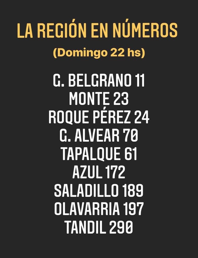 En ésta noche de domingo, y con ciudades que están prontas a actualizar datos, la región sigue creciendo en cantidad de casos activos de Covid 19. También es cierto que en localidades vecinas se ha denunciado que no contabilizan los casos activos por criterio clínico y solamente ingresan en la estadística los resultados de pacientes hisopados.