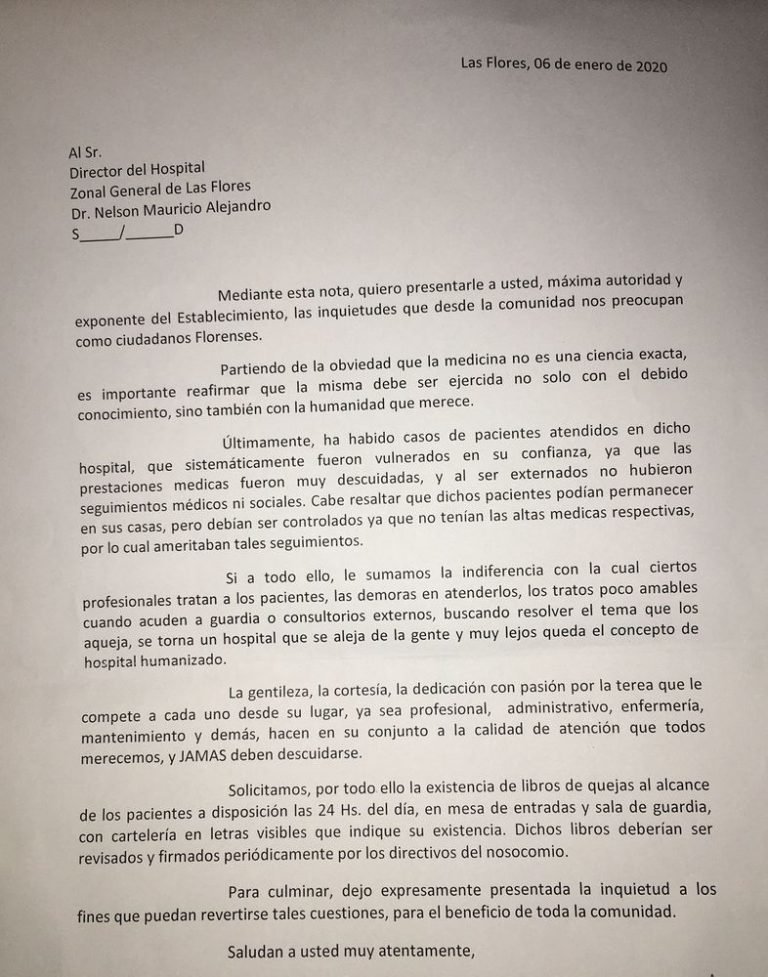 Los Concejales del Frente de Todos – Todos x Las Flores enviaron una nota al Director del Hospital Zonal General, Dr. Mauricio Alejandro, solicitando que ante diversos reclamos de varios vecinos, se tenga en cuenta la posibilidad de colocar un Libro de Quejas donde los pacientes puedan manifestar sus inquietudes.