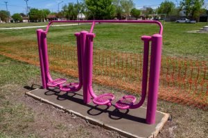 Estos aparatos de plaza para realizar ejercicios físicos tienen la particularidad que están pintados de rosa que es el color que caracteriza la lucha y las distintas acciones que se llevan adelante en marco de la prevención de la enfermedad.