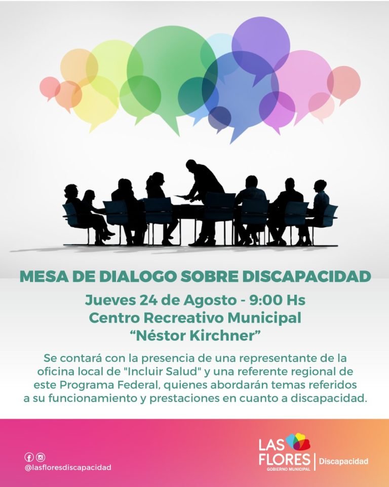 La Dirección de Discapacidad, dependiente de la Secretaría de Desarrollo Humano, informa que se llevará a cabo un nuevo encuentro de la Mesa de Diálogo de Discapacidad que se llevará a cabo este jueves 24 de agosto a las 9 horas en el Centro Recreativo Municipal.