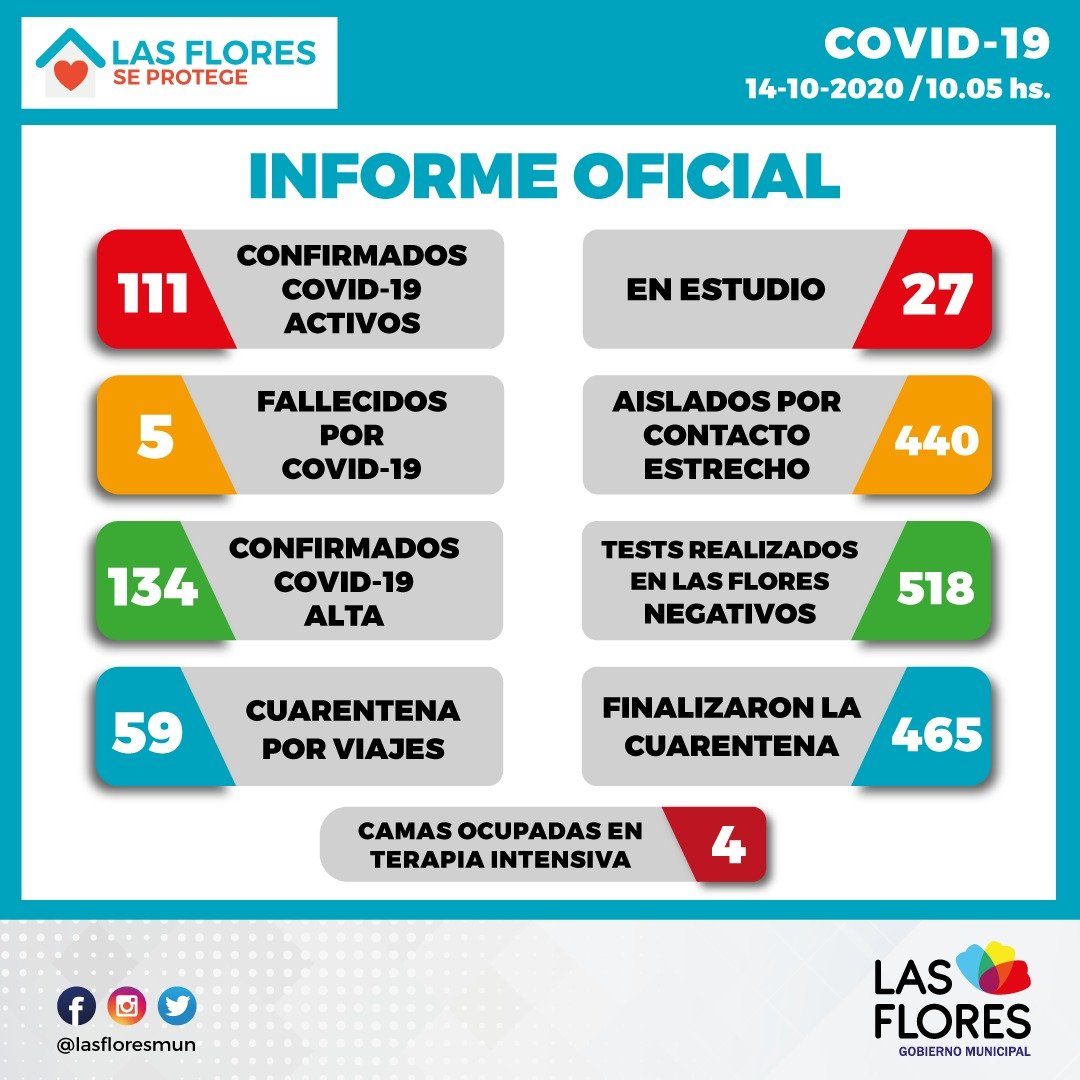 En el día de hoy ingresaron nuevos resultados, arrojando 4 negativos y 6 positivos. 4 por medio de hisopados PCR y 2 por test de antígeno, anosmia.