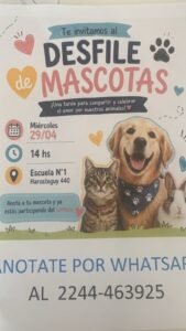 El próximo miércoles 29 de abril a las 14hs. se llevará a cabo una nueva edición del ya tradicional desfile de mascotas que organiza la Escuela N° 1 frente a dicho establecimiento educativo ubicado en Harosteguy 440.