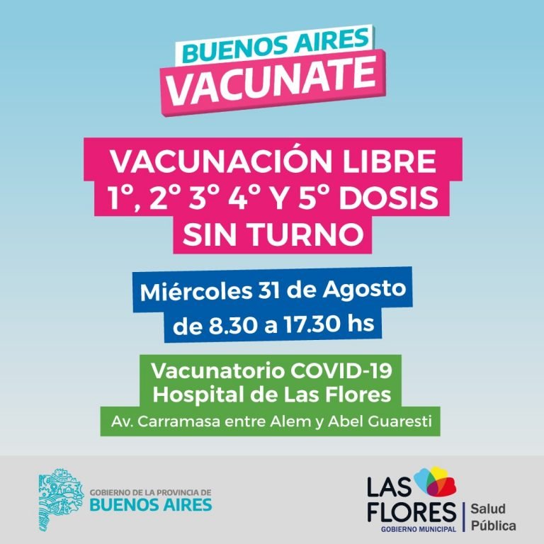 La Secretaría de Salud Pública informa a la comunidad que el miércoles 31 se aplicarán vacunas contra el COVID de manera libre y sin turno en el Vacunatorio ubicado en el Hospital Zonal General de nuestra ciudad con acceso sobre Av. Carramasa, casi esquina Alem.