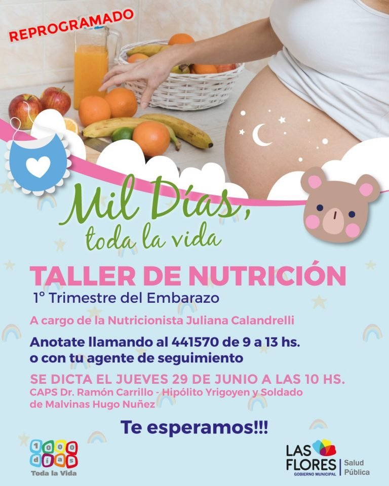 En marco del Programa Municipal “Mil días, toda la vida” este jueves 29 a las 10 horas en el Centro de Atención Primaria de la Salud “Ramón Carrillo” (Hipólito Yrigoyen y Soldado de Malvinas Hugo Nuñez) se realizará el Taller de Nutrición, primer trimestre de embarazo, a cargo de la Licenciada en Nutrición Juliana Calandrelli.