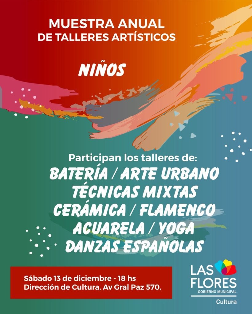 Este sábado 13 de diciembre desde las 18 horas en la sala “Hugo Mario Ianivelli” de la avenida General Paz 570, se llevará a cabo una Muestra General de las distintas disciplinas artísticas para niños que durante el año forman parte de la serie de talleres y actividades programadas por la Dirección Municipal de Cultura.