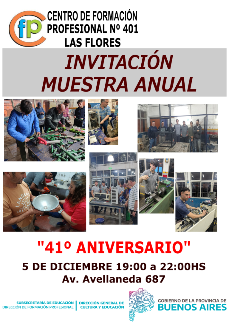 El Centro de Formación Profesional N°401 invita a la Muestra Anual por el 41º Aniversario, el viernes 5 de diciembre desde las 19:00hs a las 22:00 hs en Av Avellaneda 687.