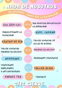 Se planificó un proyecto conjunto bajo el lema “NADA SOBRE NOSOTROS, SIN NOSOTROS” y se realizarán una serie de actividades por cada institución que trabaja con discapacidad, desde el mes de octubre hasta el día 3 de diciembre “Día de la Discapacidad” donde cerraremos dicho proyecto, con una muestra general, con la participación de todas las instituciones antes nombradas.