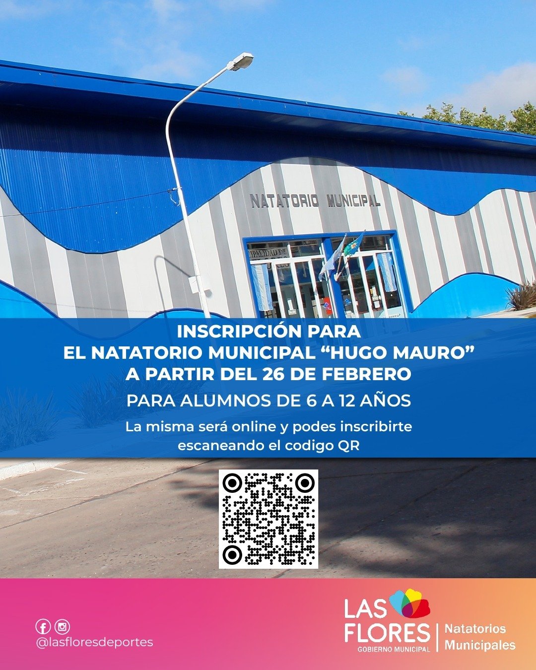 La misma se realizará online desde la página del Natatorio https://lasflores.gob.ar/inscripcionnatatorio/ o a través del código QR.