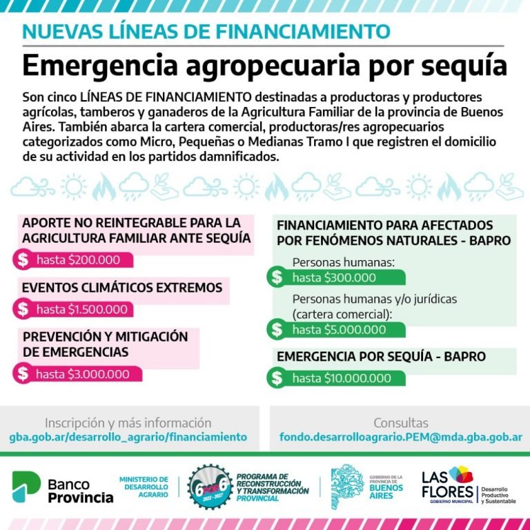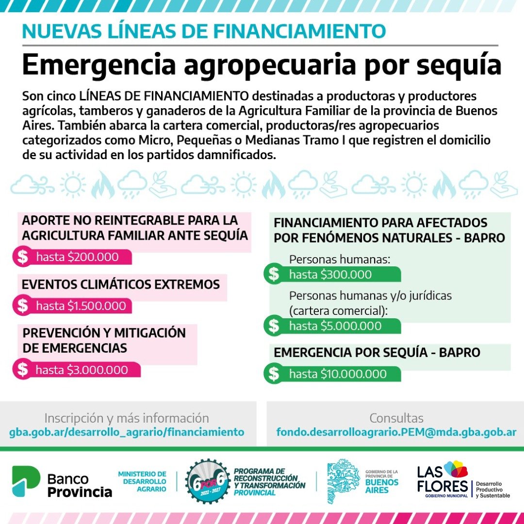 La Dirección de Asuntos Agropecuarios informa qué están disponibles cinco nuevas líneas de financiamiento del Ministerio de Desarrollo Agrario y del Banco Provincia destinadas a productoras y productores, ante la declaración de Emergencia Agropecuaria en el Partido de Las Flores.