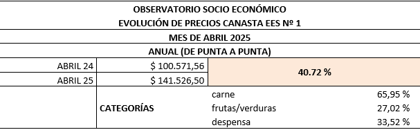 En el mes de Abril de 2025 la variación de precios de los 42 productos que componen la canasta de la Escuela, alcanzó el 3.68 %. Durante este mes, las variaciones por rubros fueron los siguientes: Despensa 5.51 %, Carne 6.20 % y Frutas y verduras -9.02%