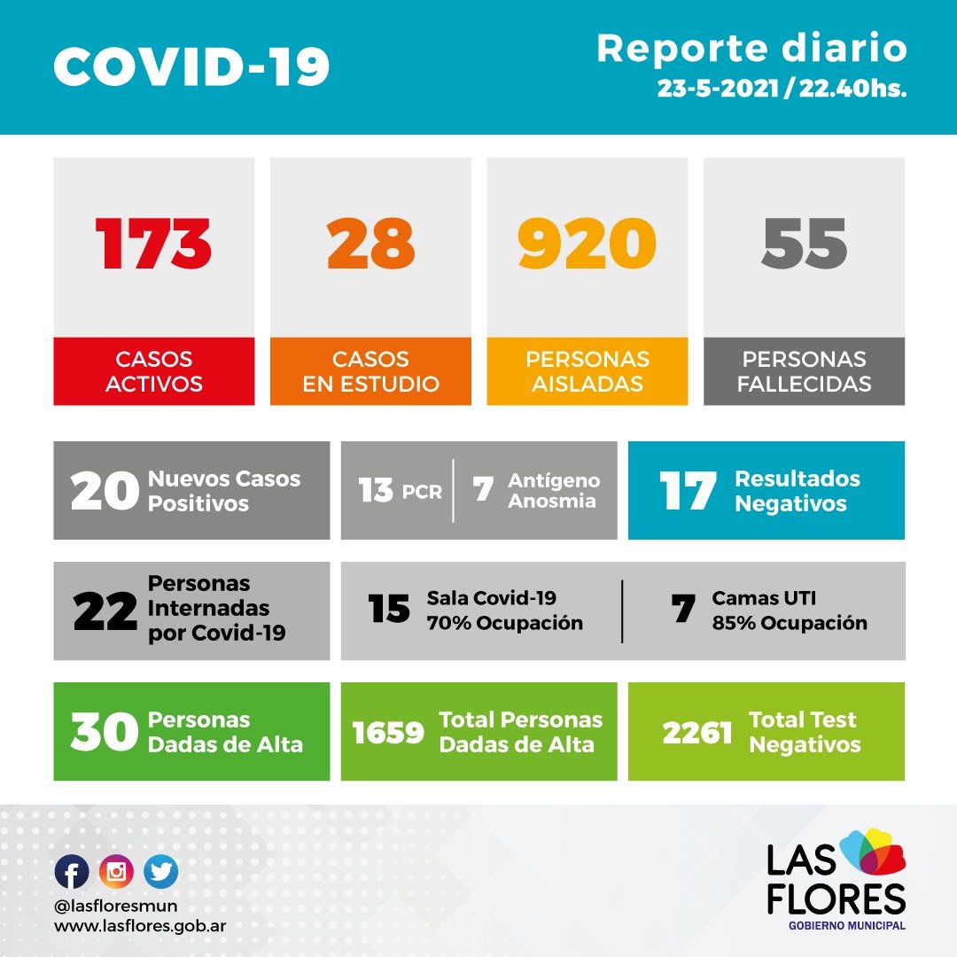 Ingresaron nuevos resultados arrojando 20 positivos, 13 por medio de hisopados PCR y 7 por test de antígeno, anosmia y 17 resultados negativos.