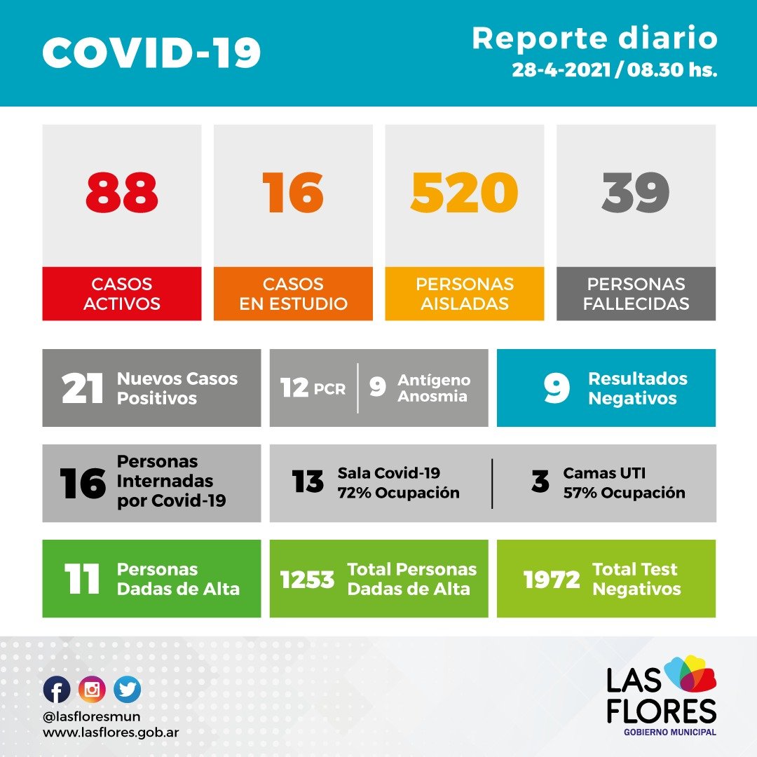En el día de hoy ingresaron nuevos resultados arrojando 21 positivos. 12 por medio de hisopados PCR y 9 por test de antígeno, anosmia y 9 resultados negativos.