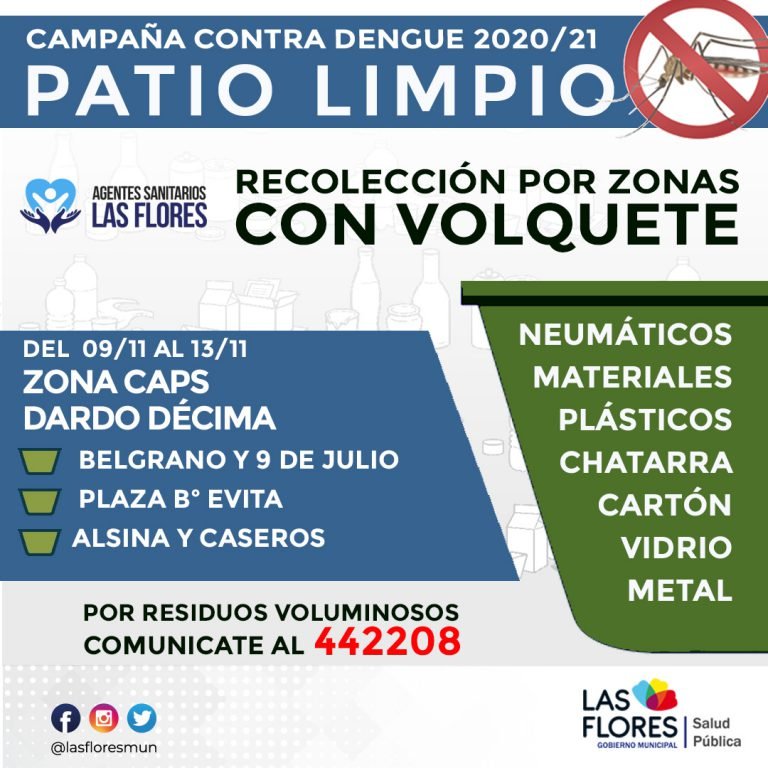La Secretaría de Salud conjuntamente con la Secretaría de Obras Públicas informan a la comunidad que, en el marco de la campaña Patio Limpio, durante el transcurso de esta semana, desde hoy hasta el viernes 13 inclusive, los volquetes estarán ubicados en las calles Belgrano y 9 de Julio, Alsina y Caseros y Plaza Barrio Evita, tal como se viene haciendo en distintas zonas de la ciudad desde el inicio de la campaña de concientización, prevención y descacharrización.