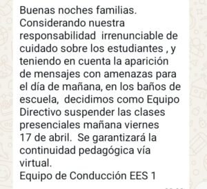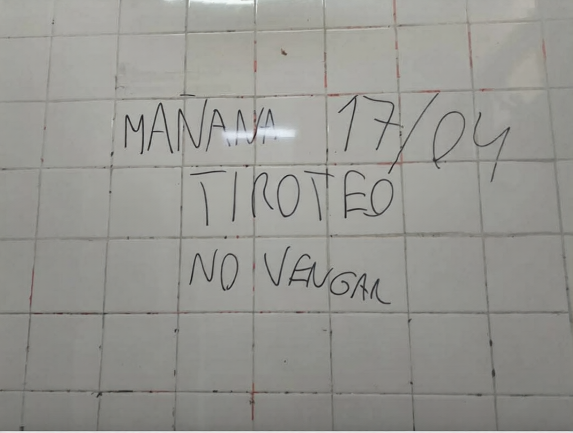 Recordamos que en el dia de hoy se registraron una ola de amenazas de tiroteo escritas en paredes en colegios de todo el país, si bien son mensajes anónimos, la justicia y las autoridades de educación remarcaron que no se lo puede tomar como broma y que se enmarca como delito que llevará a graves sanciones una vez que se identifiquen a los responsables.
