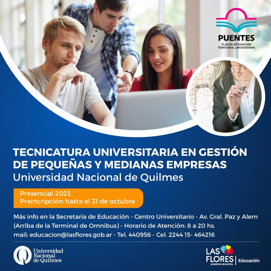 La Secretaría de Educación comunica que se encuentra abierta la preinscripción, hasta el día 31 de octubre de 2022, a la Tecnicatura Universitaria en Gestión de pequeñas y medianas empresas, de la Universidad Nacional de Quilmes.