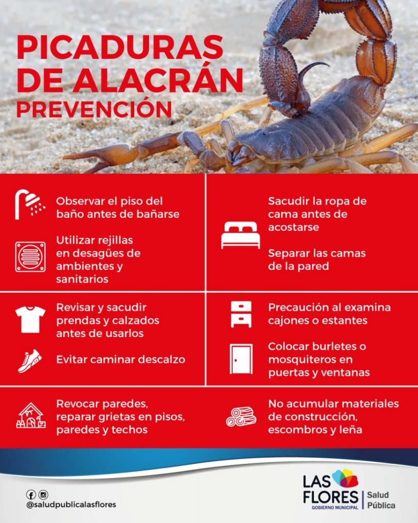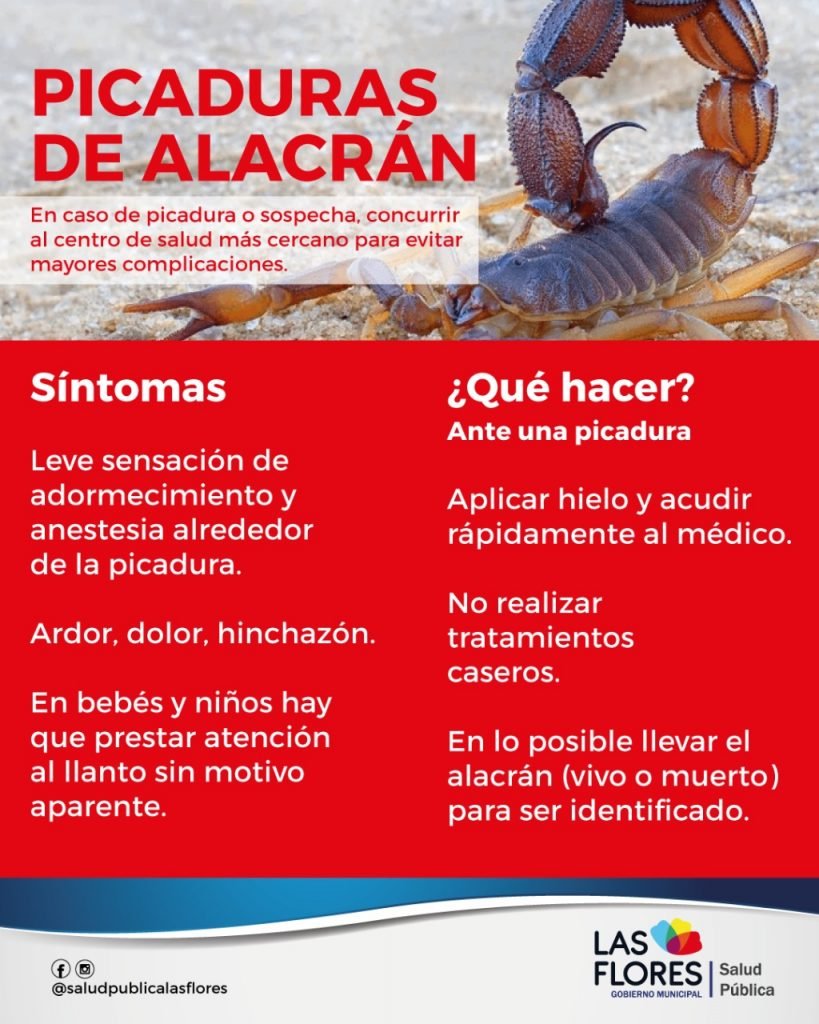 En caso de picaduras: no realizar tratamientos caseros, aplicar hielo y consultar rápidamente al médico, en el centro de Atención Primaria o al Hospital, en lo posible llevar el escorpión para ser identificado.