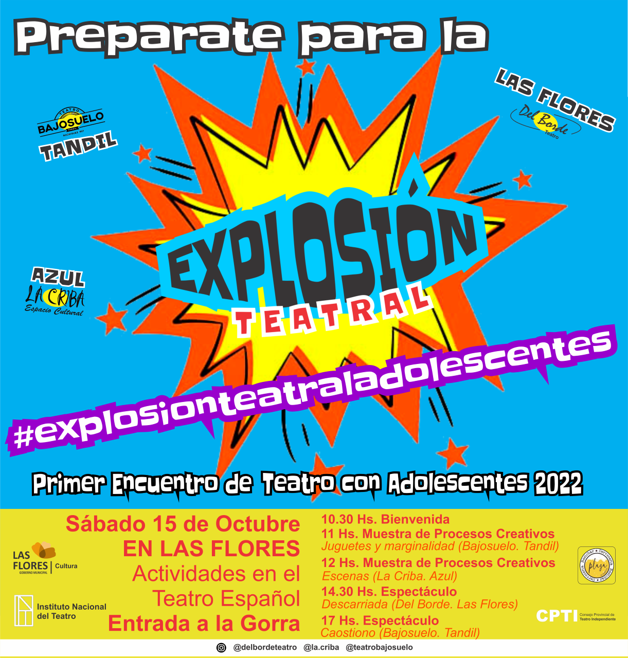 El pasado sábado 24 de septiembre se inauguró simultáneamente en Azul, Las Flores y Tandil el Primer Encuentro de Teatro con Adolescentes “Explosión Teatral 2022”, que se llevará a cabo durante septiembre, octubre y noviembre, organizado por las agrupaciones teatrales La Criba (Azul), Murallón Teatro (Tandil) y Del Borde Teatro (Las Flores).