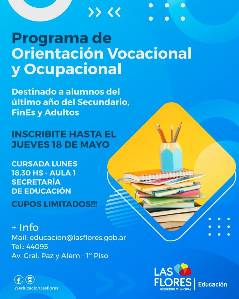 Por informes comunicarse al mail educacion@lasflores.gob.ar, al TE 440956, Av. Gral Paz y Alem, 1er. Piso.