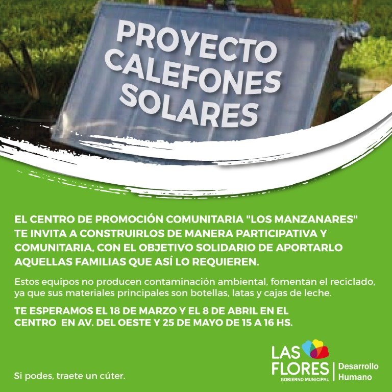 La Secretaría de Desarrollo Humano recuerda que el Centro de Promoción Comunitaria Los Manzanares retomo el proyecto de «Calefones Solares», los que se construyen de manera participativa y comunitaria, con el objetivo solidario de aportarlo aquellas familias que así lo requieren. El colector cumple una función fundamental brindando agua caliente en cada hogar que no cuente con este servicio. Su funcionamiento se basa en el calentamiento de agua mediante calor solar. Este equipo no produce contaminación ambiental y fomenta el reciclado, ya que sus materiales principales son botellas, latas y cajas de leche.