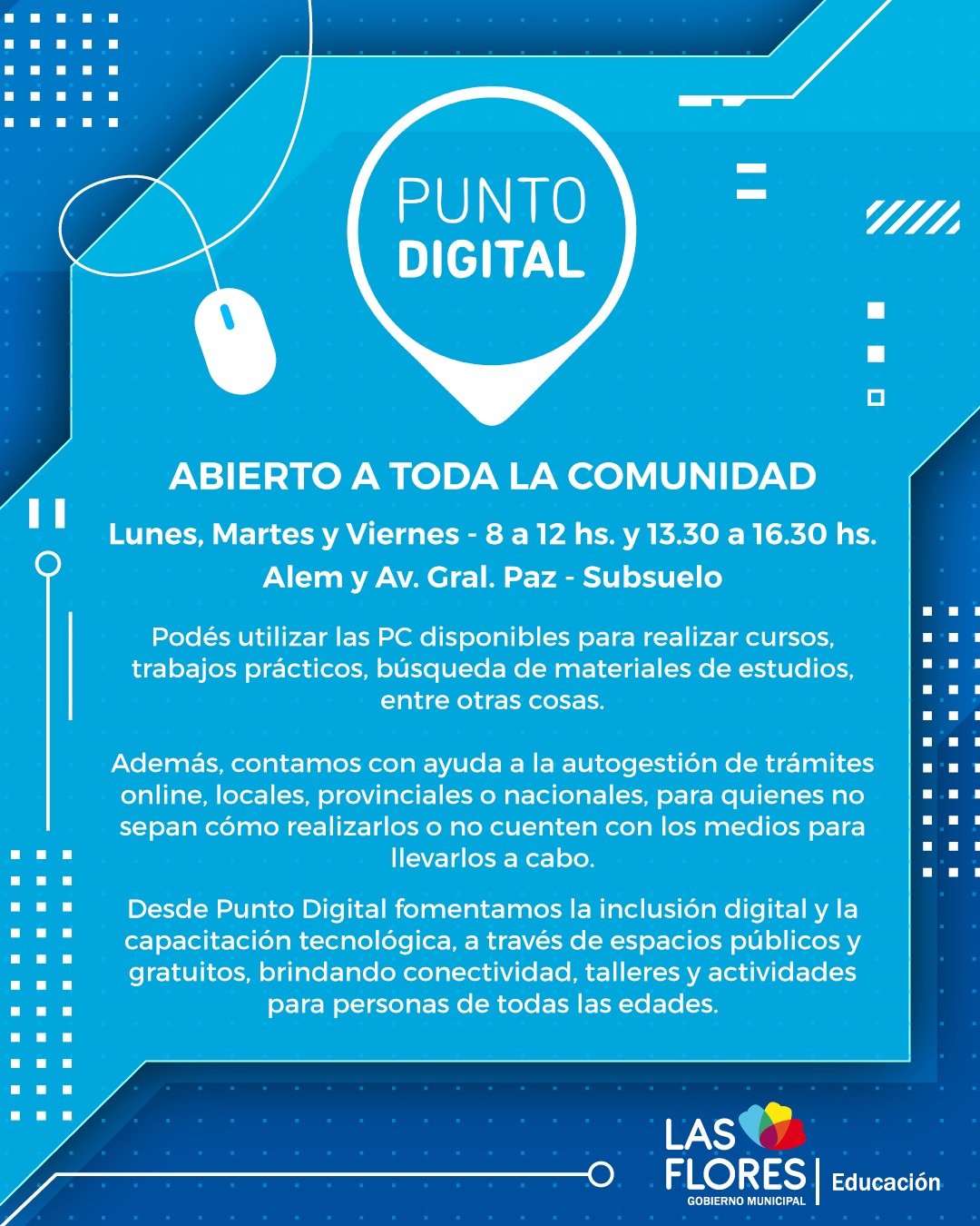 Los días lunes, martes y viernes, de 8 a 12 horas y de 13.30 a 16.30 horas, se encuentra abierto a la comunidad el espacio de Punto Digital, ubicado en Alem y Gral. Paz, subsuelo.