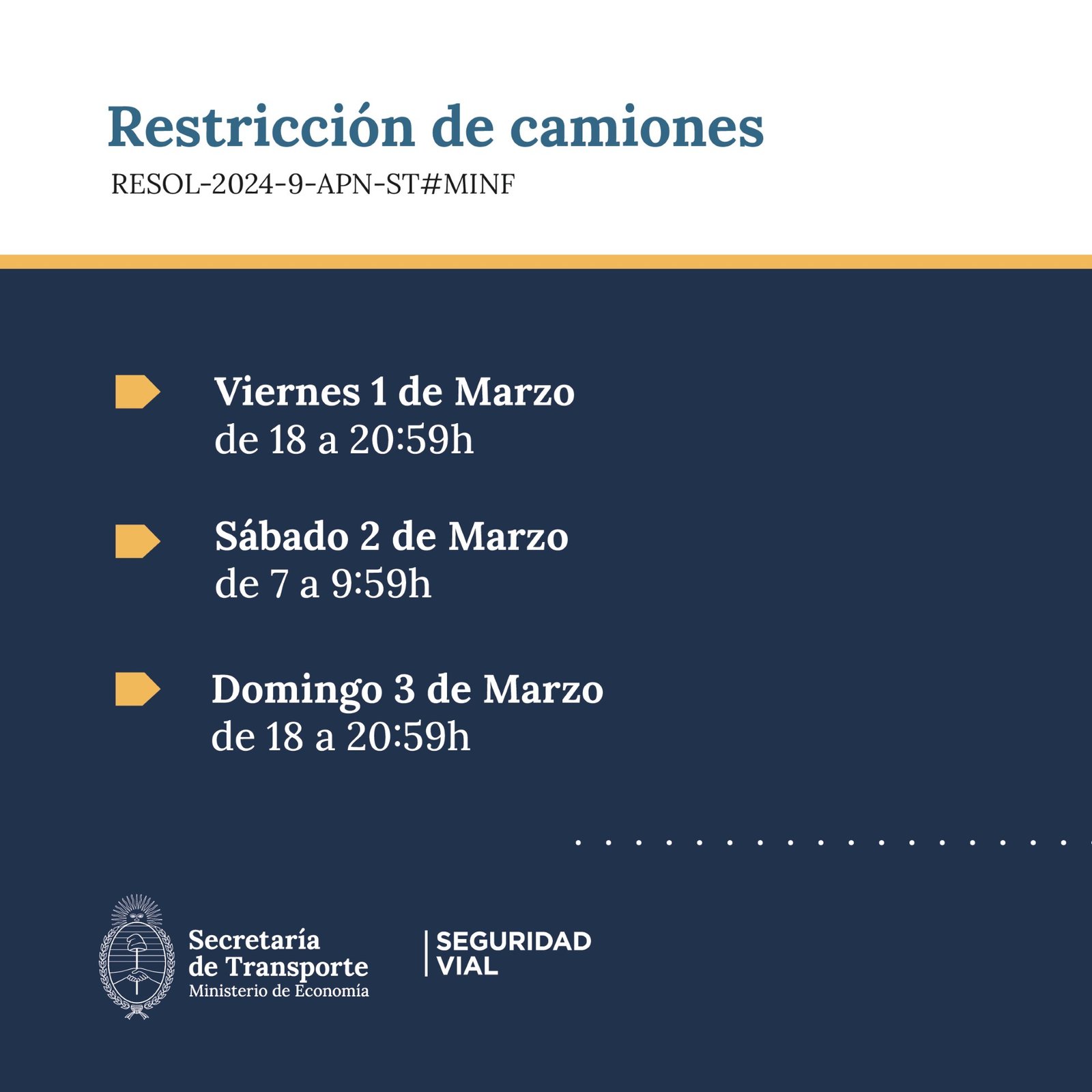 La medida de la Agencia Nacional de Seguridad Vial (ANSV), que alcanza a camiones de más de 3.500 kilos, comenzará este viernes desde las 18 y se extenderá hasta las 20:59 horas. Continuará el sábado entre las 7 y 9:59 horas y el domingo entre las 18 y 20:59 horas.