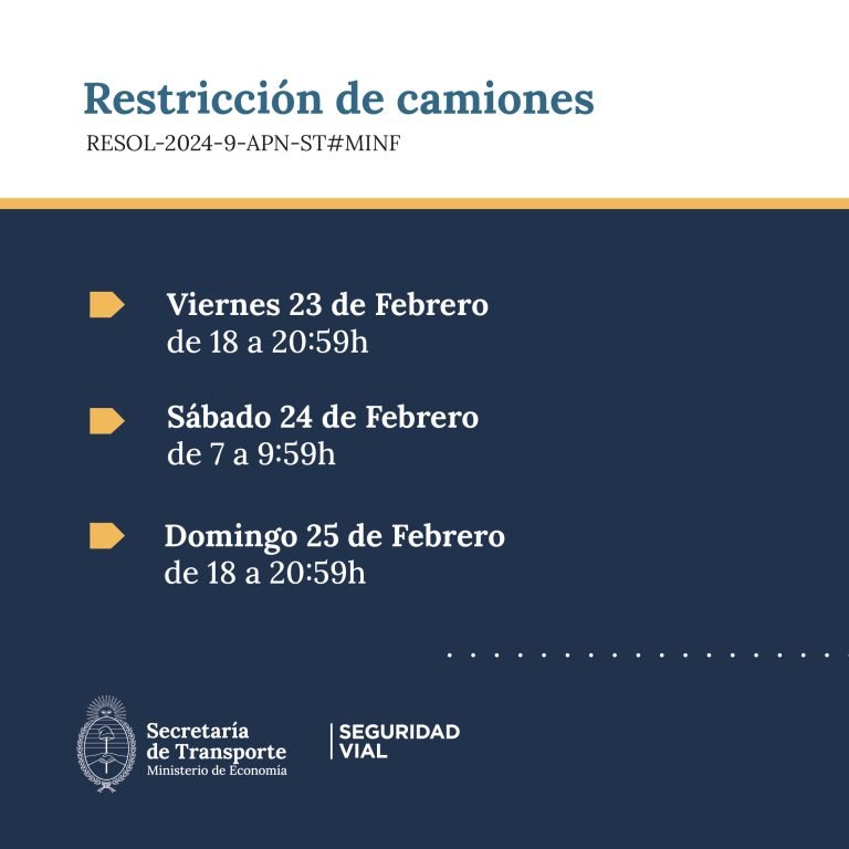 Rutas, fechas y horarios de la restricción: https://www.argentina.gob.ar/seguridadvial/restriccion-de-camiones/febrero-2024