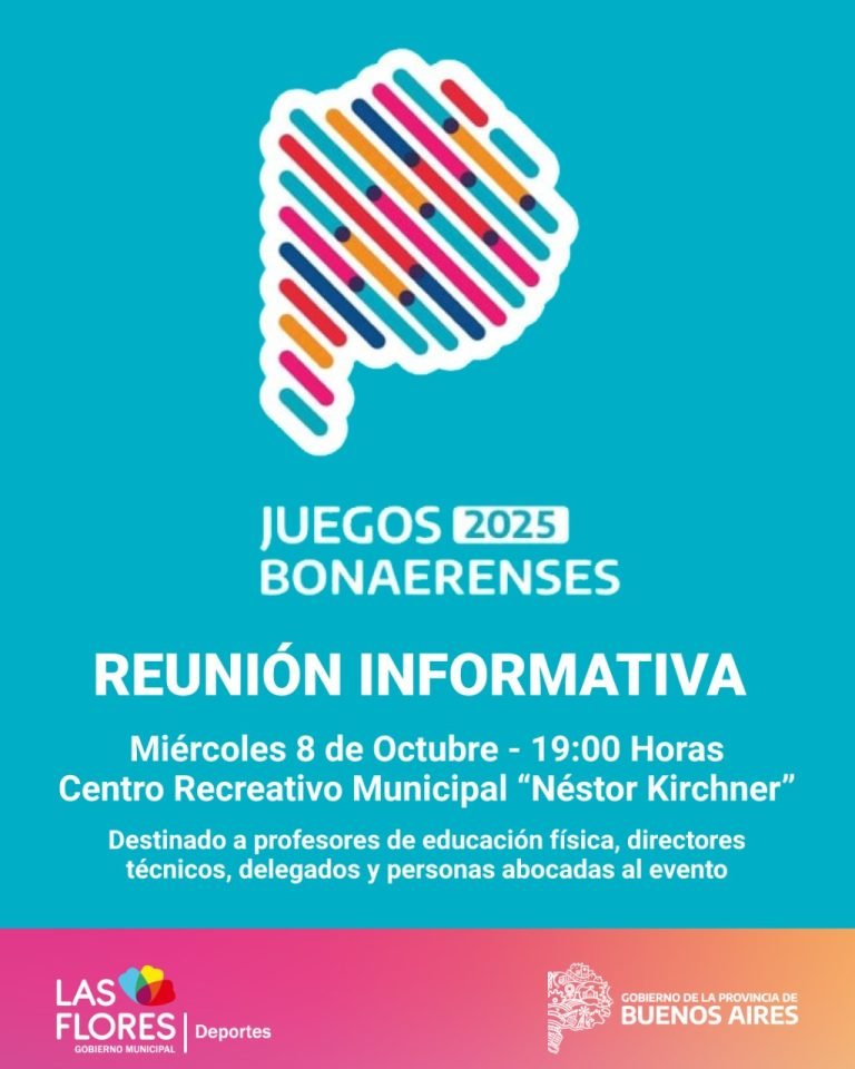 La Secretaría de Deportes y Cultura informa que mañana miércoles 8 de octubre a las 19 horas, en el Centro Recreativo Municipal Néstor Kirchner, se llevará a cabo la reunión informativa con respecto a la final Provincial de los Juegos Bonaerenses 2025, que se desarrollarán desde el lunes 13 hasta el sábado 18 de octubre en Mar del Plata.