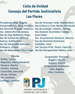 El PJ Las Flores presentó a través de sus redes la Lista de unidad para la conformación del Consejo del Partido Justicialista de la ciudad Las Flores por el periodo 2026 – 2029.