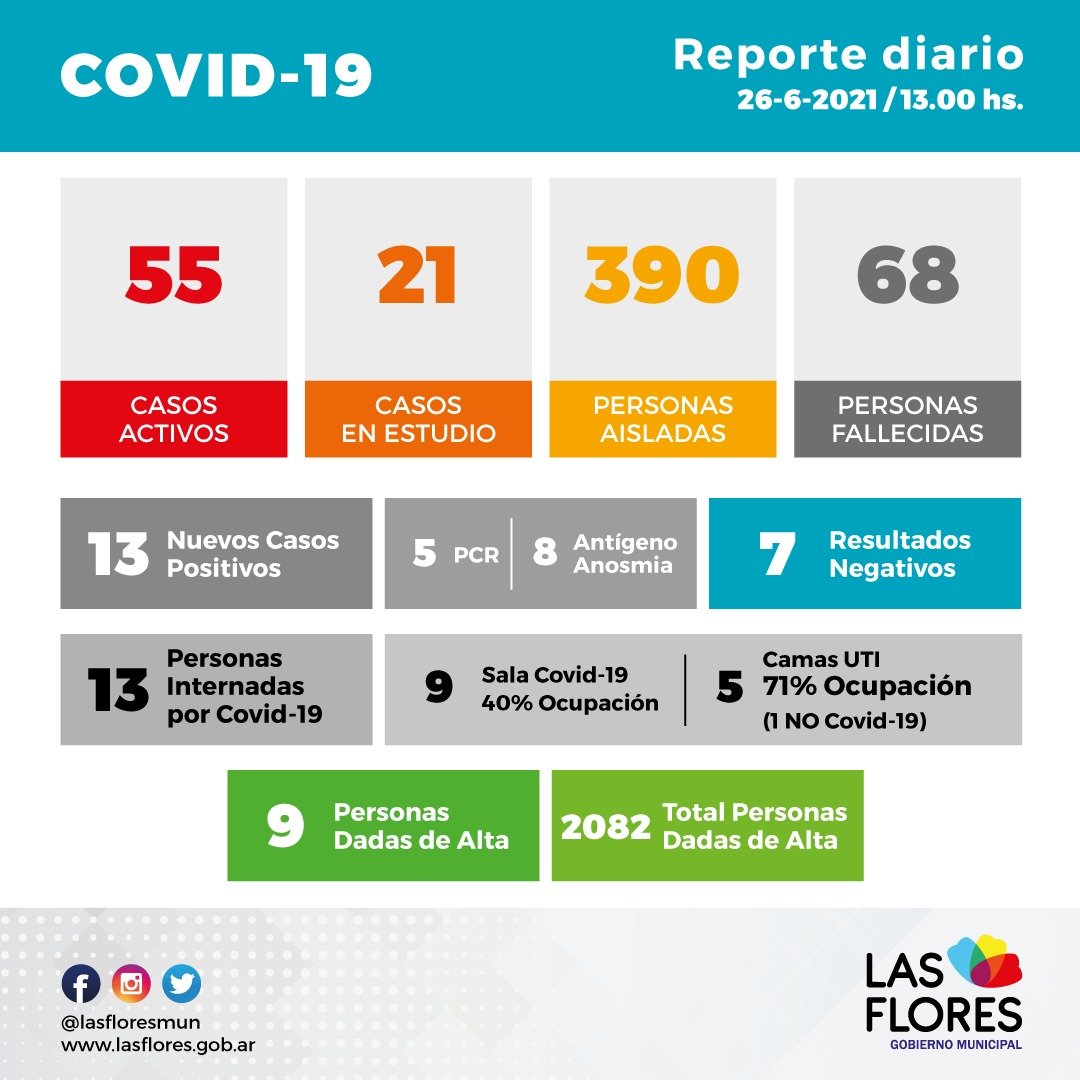 En el día de hoy ingresaron nuevos resultados, arrojando 13 positivos, 5 por medio de hisopados PCR y 8 por test de antígeno, anosmia y 7 resultados negativos.