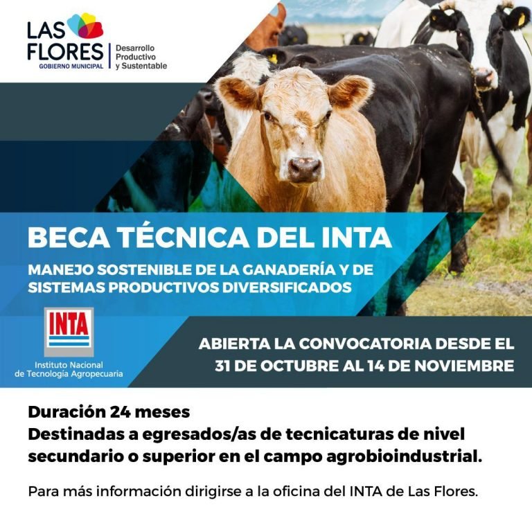 La Dirección de Asuntos Agrarios de la Secretaría de Desarrollo Productivo y Sustentable informa que el 31 de octubre inicia el concurso para acceder a la Beca Técnica sobre “Manejo sostenible de la ganadería y de sistemas productivos diversificados en los territorios de las Agencias de Extensión Rural (AER) de Las Flores y de Saladillo de la Extensión Experimental (EEA) Cuenca del Salado del INTA.
