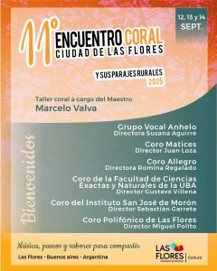Arribarán a Las Flores para formar parte del 11° Encuentro Coral Ciudad de Las Flores y sus Parajes Rurales: Grupo Vocal Anhelo, Coro del Instituto San José de Morón, Coro Matices, Coro de la Facultad de Ciencias Exactas y Naturales de la UBA y el Coro Allegro.