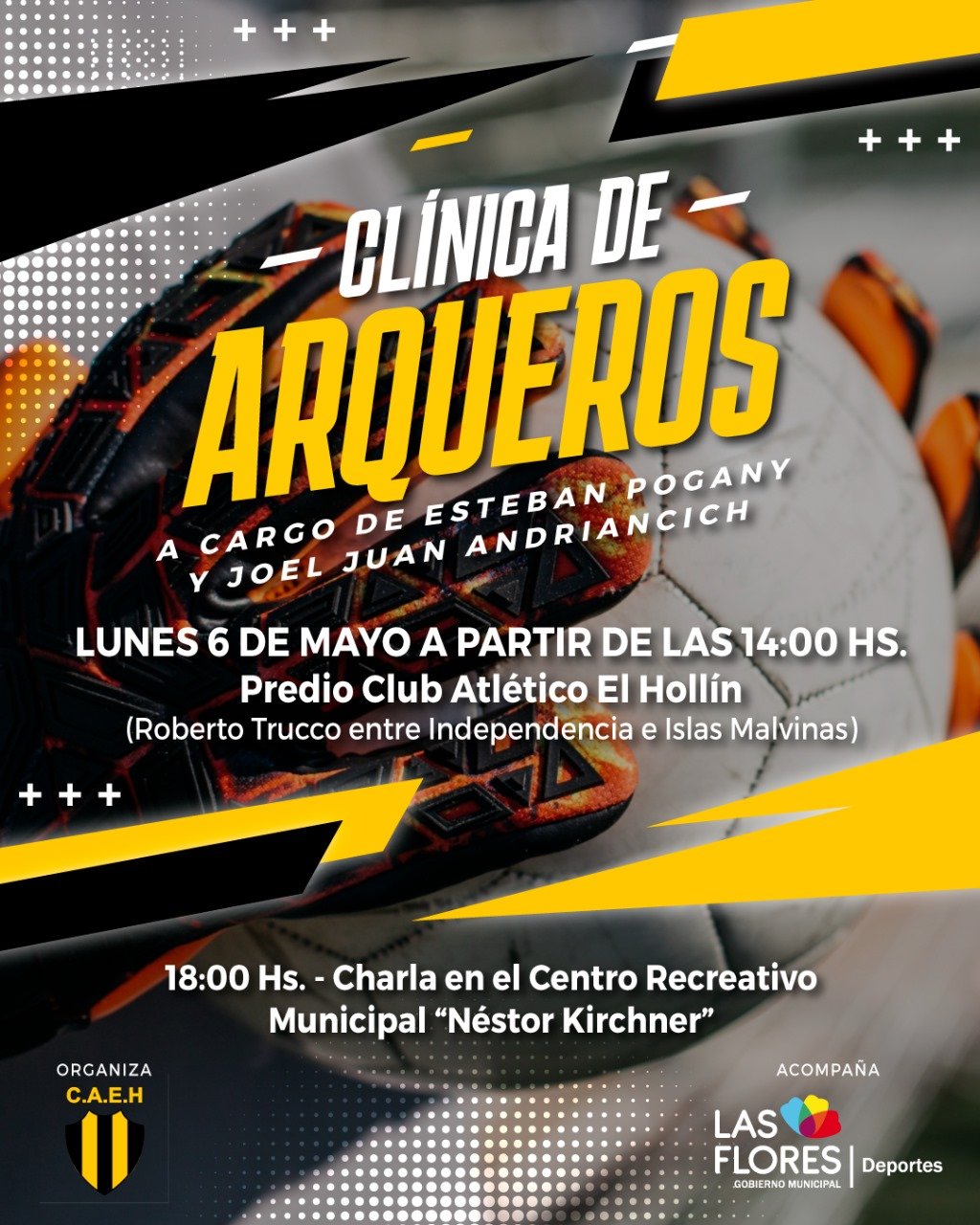 Con el acompañamiento de la Municipalidad de Las Flores, a través de la Secretaría de Deportes y Cultura, el Club Atlético El Hollín organizará el lunes 6 de mayo una Clínica de Arqueros a cargo de Joel Juan Andriancich y Esteban Pogany, reconocido futbolista que supo defender los tres palos de Boca Juniors e Independiente de Avellaneda, entre otras instituciones.
