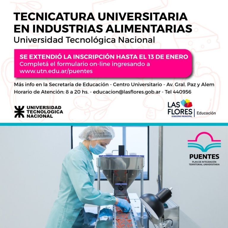 La Secretaría de Educación informa que la inscripción a la Tecnicatura Universitaria en Industria Alimentaria de la Universidad Tecnológica Nacional se extendió hasta el viernes 13 de enero de 2023 inclusive.