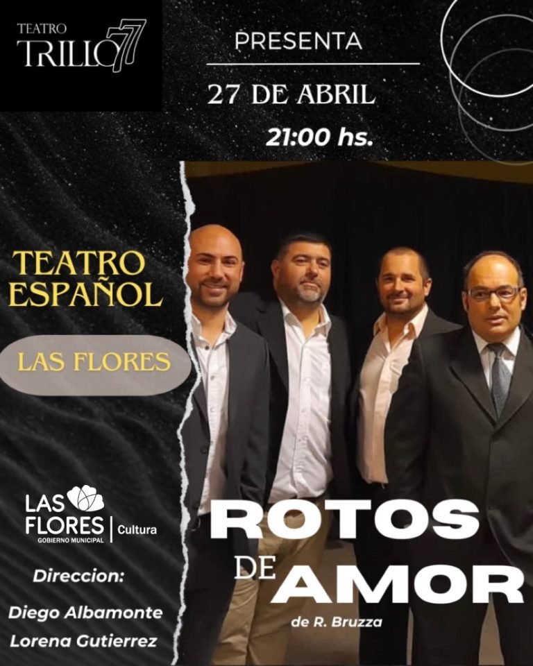 El próximo sábado 27 de abril a las 21 horas, la compañía de Teatro Trillo 77 de la ciudad de Rojas, presentará en el Teatro Español de Las Flores la obra “Rotos de Amor”, de Rafael Bruza. Una comedia que habla, de manera tierna, del amor y sus desencuentros.