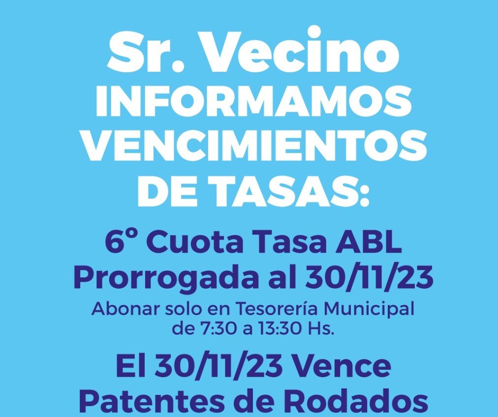 La Secretaría de Economía y Finanzas informa que se prorroga hasta el jueves 30 de noviembre el vencimiento para la 6° cuota de 2023 de la Tasa por Alumbrado, Barrido y Limpieza.