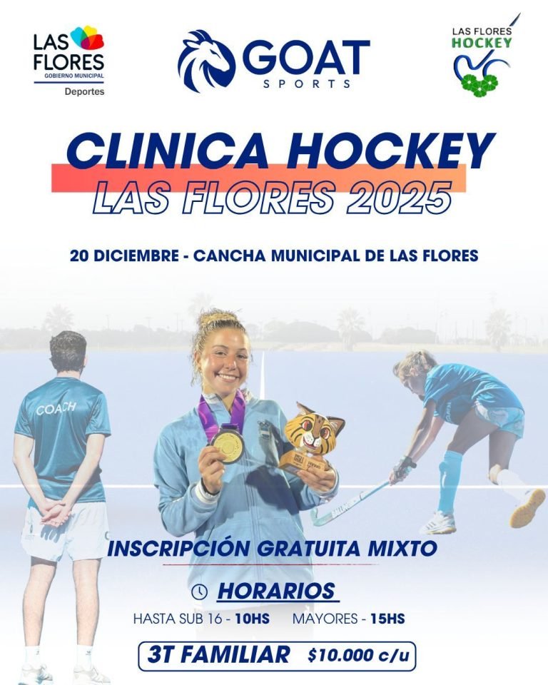 La Secretaría de Deportes y Cultura de la Municipalidad de Las Flores, en su incansable labor de promover el deporte, y la Asociación Las Flores Hockey, precursor de la infraestructura y el desarrollo del hockey, invita a la Escuela Municipal de Hockey, Hockey Femenino Las Flores, Hockey Masculino Las Flores (Matungos y Matunguitos) y Club Atlético El Taladro a la Clínica GOAT Sports, que se llevará a cabo el sábado 20 de diciembre en la cancha del Centro Recreativo Municipal “Néstor Kirchner” (Islas Malvinas entre Roberto Trucco y Rivadavia).