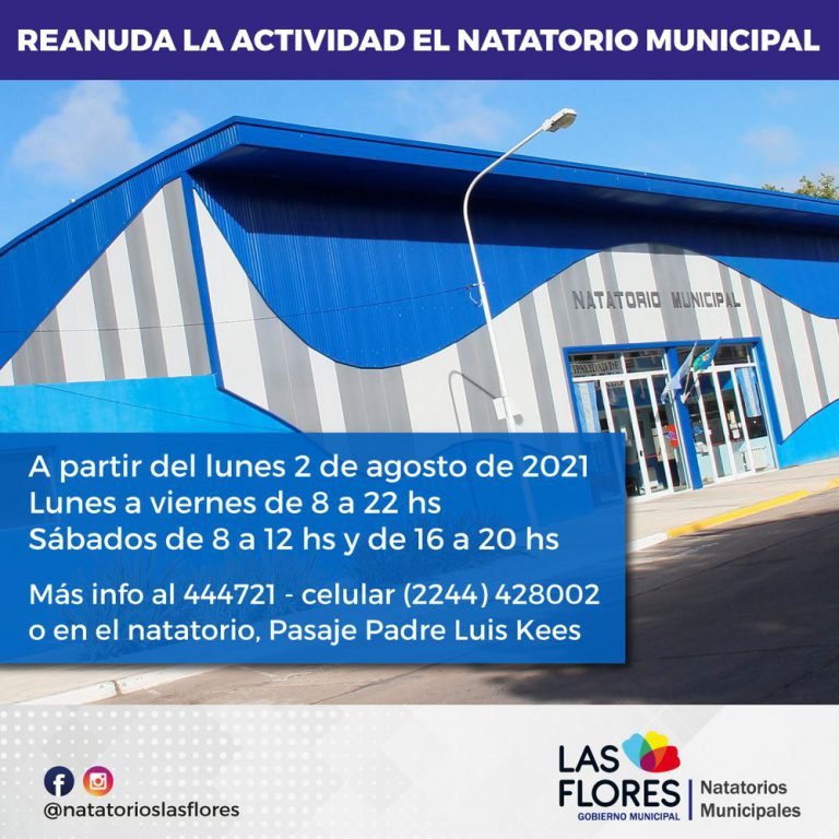 Por consultas e informes comunicarse al 444721 (teléfono fijo) o al celular (2244) 428002, como así también se podrá recibir novedades en el Facebook @natatorioslasflores o dirigirse a las instalaciones ubicadas sobre el Pasaje Padre Luis Kees.