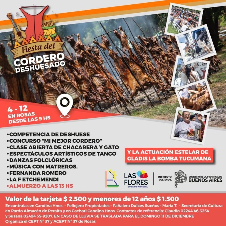 Bajo la organización del Centro Educativo de Alternancia CEPT Nº 37 y ACEPT Nº 37 de Rosas en conjunto con la Municipalidad de Las Flores, el encuentro festivo tiene programado una competencia de deshuese, el concurso “Mi Mejor Cordero”, una Clase Abierta de Chacarera y Gato, y otros espectáculos artísticos de Tango, Danzas Folklóricas y la presentación del grupo Matreros, Fernanda Romero y la F Etchemendi.