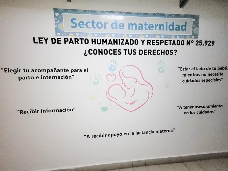 El mural fue pintado en el pasillo del sector de Maternidad y en esta misma acción cada trabajador de la salud de dicho servicio, plasmará su mano a modo de compromiso de hacer cumplir con los derechos mencionados.