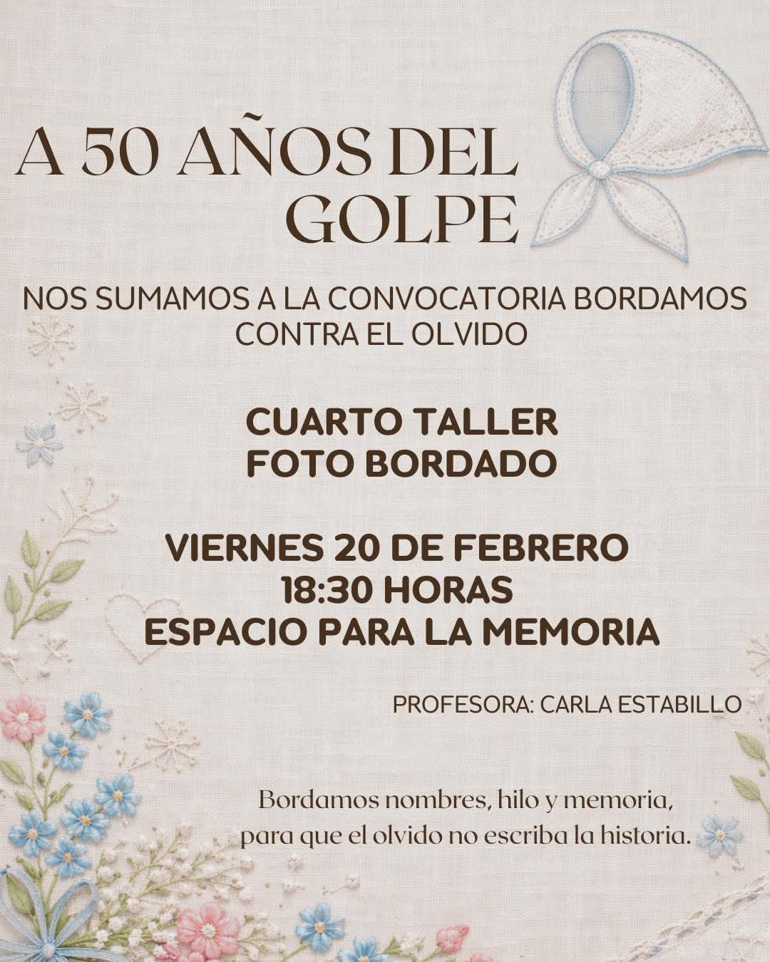 Desde el Espacio para la Memoria se invita al taller de bordado este viernes 20 de febrero.