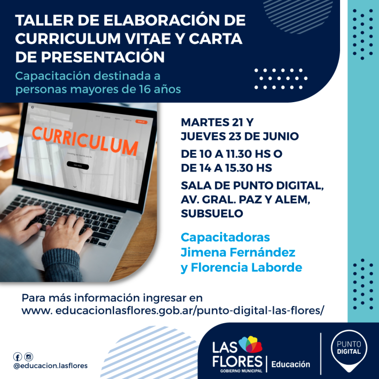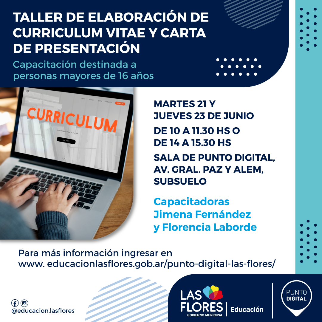 La capacitación, que está destinada a personas mayores de 16 años, tiene como objetivo realzar las habilidades, experiencias y valores que se requieren para los puestos de trabajo, así como también la creación de un Curriculum Vitae y Carta de presentación, que sean correctos, modernos, creativos e idóneos para cada persona. Al finalizar el taller, podrán llevarse sus CV impresos.