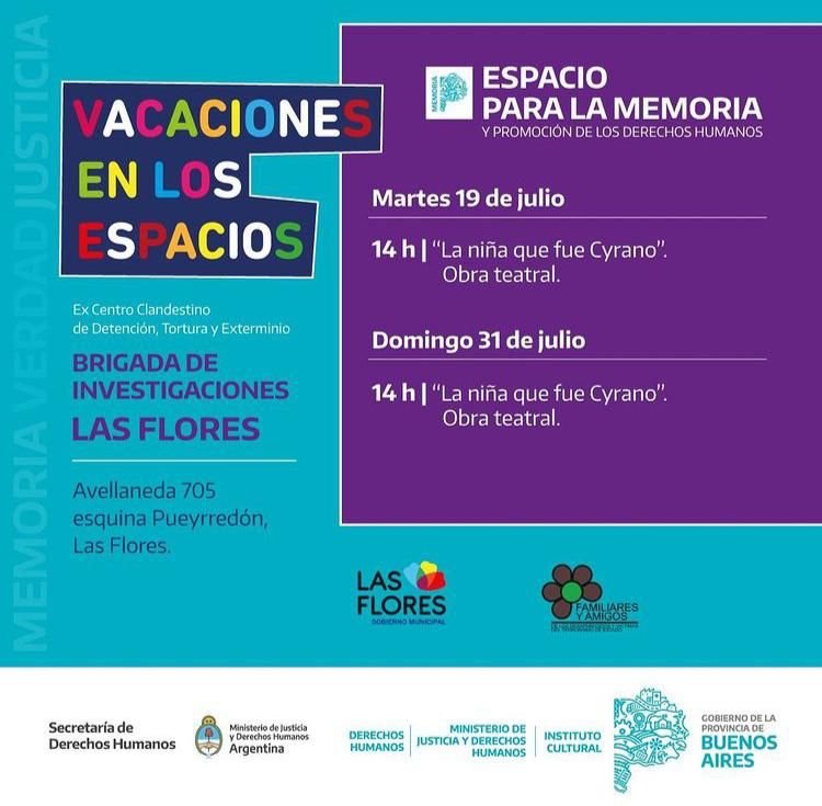 En el marco de las vacaciones de invierno, la provincia de Buenos Aires auspicia «Vacaciones en los Espacios». En nuestra ciudad será en el Ex centro clandestino de detención, tortura y exterminio, este martes 19 y el próximo domingo 31 de julio a las 14 hs, con la obra teatral «La niña que fue Cyrano».