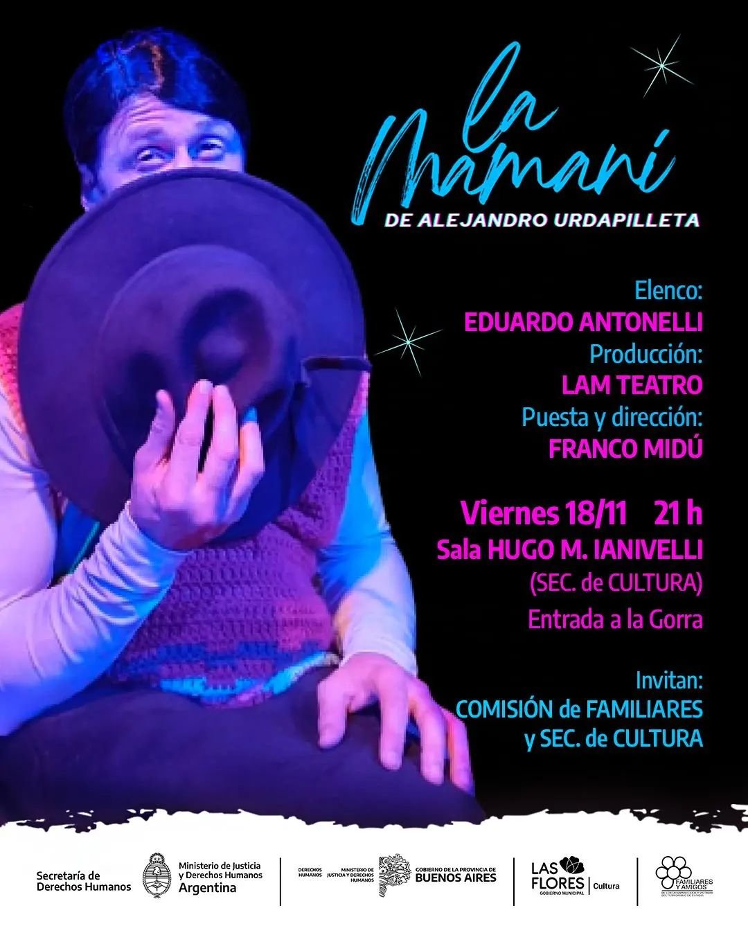 Hoy viernes 18, a partir de las 21 horas en la Sala “Hugo Mario Ianivelli” de la Secretaría de Cultura, se presenta “La Mamani”, una producción teatral de la compañía LAM Teatro de Saladillo, que llega a nuestra ciudad por iniciativa de la Comisión de Familiares y Amigos de Desaparecidos y Víctimas del Terrorismo de Estado de Las Flores.