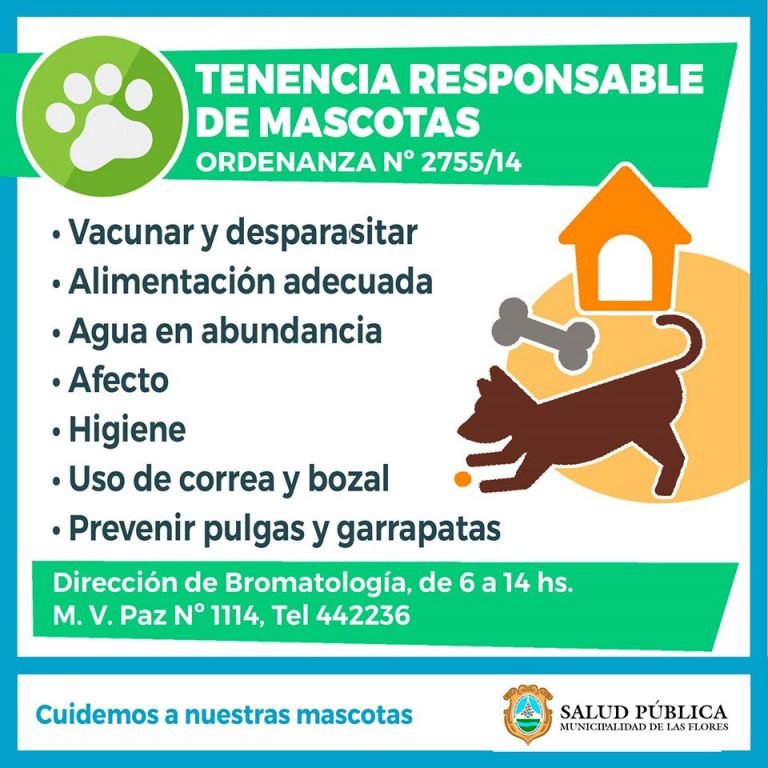 La Municipalidad de Las Flores, a través de la Dirección de Bromatología, recuerda a la población la vigencia de las Ordenanzas Nº 2755/14 de Tenencia Responsable de Mascotas y Nº 2150/07 de Tenencia de Perros Peligrosos. Los propietarios de las mascotas que no cumplan con las normas fijadas en las ordenanzas mencionadas podrán ser pasibles de las sanciones previstas por la legislación vigente.