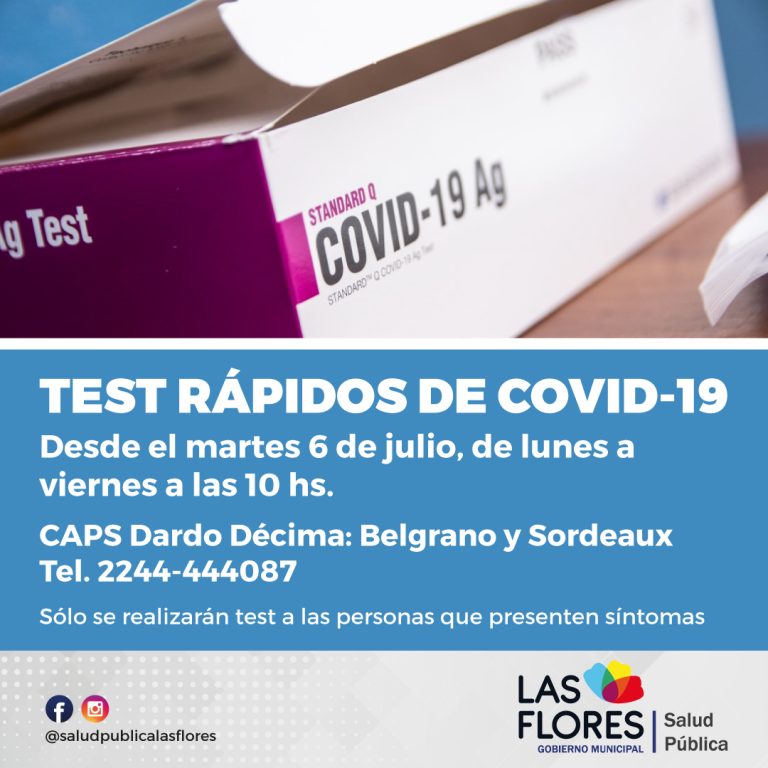 La Secretaría de Salud Pública comunica que desde hoy martes 6 de julio, de lunes a viernes a las 10 horas, se estarán realizando test rápidos de Covid-19 en el CAPS Dardo Décima ubicado en las calles Belgrano y Sordeaux.