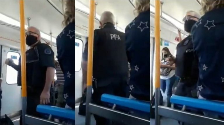 «Por favor les pido que se coloquen bien el barbijo, como corresponde», arrancó el efectivo de la Policía Federal en la formación del tren Sarmiento mientras lo grababa un pasajero. Luego advirtió: «A la persona que no lo tenga colocado la voy a bajar de la formación, sea blanco, amarillo, negro, violeta, de la raza que sea. Sea mujer, sea hombre, no me interesa».
