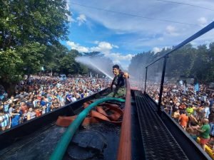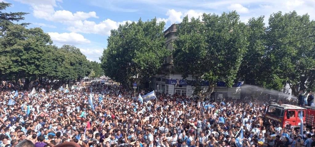 Cada rincón de la patria festejó en las calles, y Las Flores también salió a exteriorizar su alocada emoción con cánticos, bocinazos, bombos, banderas, gorros, y hasta los bomberos tratando de apaciguar con un poco de agua el tremendo calor de la locura popular.