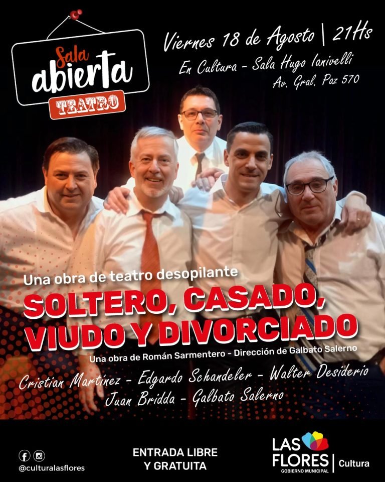 Mañana viernes 18 de agosto desde las 21 horas, en el ciclo Sala Abierta de la Secretaría de Cultura, se pondrá en escena la obra teatral “Soltero, Casado, Viudo y Divorciado”.